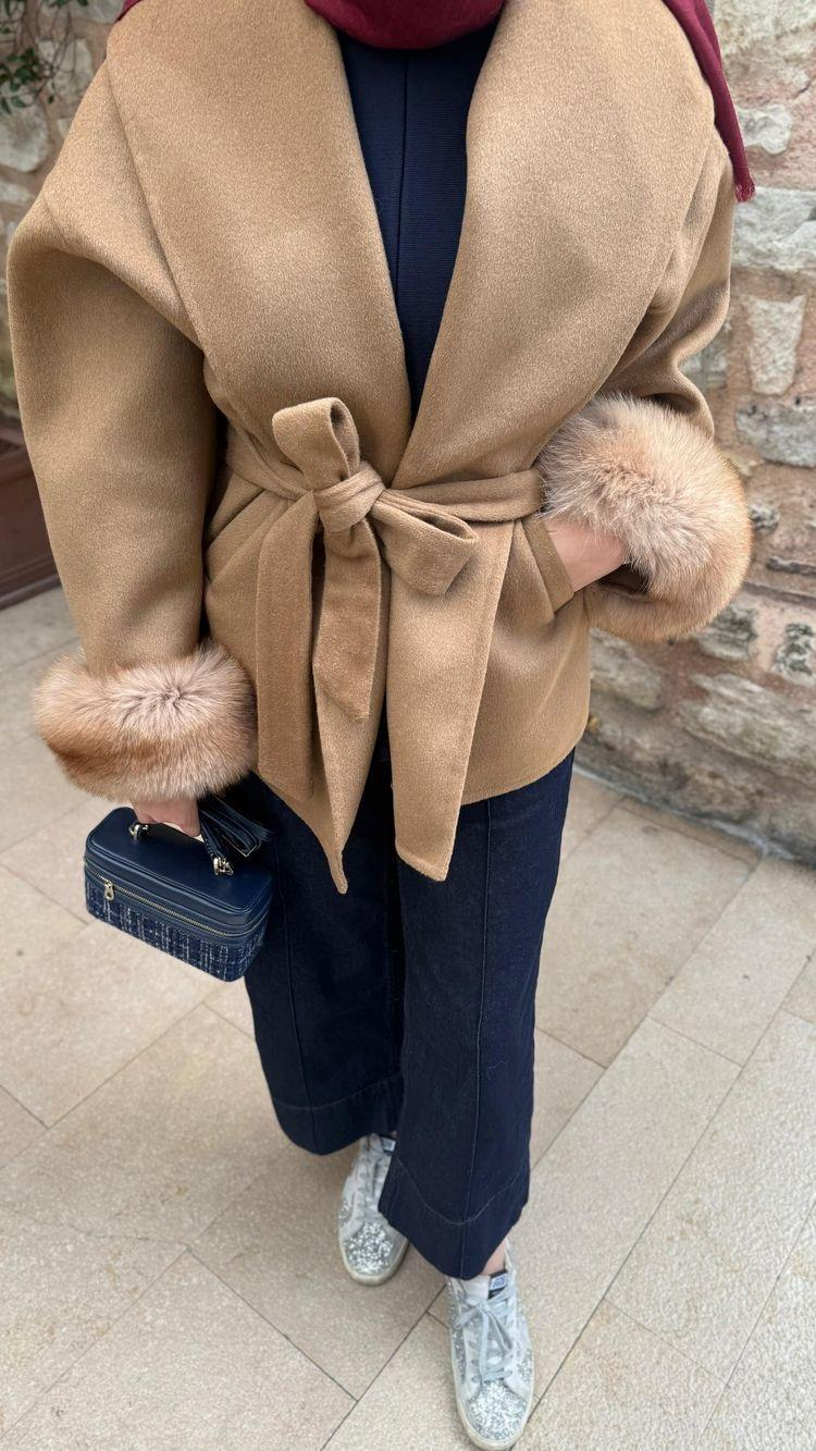 Zamansız şıklığın ve lüx konforun buluştuğu bu kaşe kaban %100 angora tilki tüyü detayı ile kış stilinizi zirveye taşır